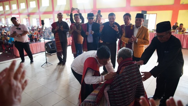 Penyematan kain ulos itu dipandu Tumbur Harianja, dengan petatah petitih dalam bahasa Batak, dan di beberapa penggalan kata diisi dengan gondang 9. Begitu sakralnya penyematan kain ulos kepada Syamsuar, tak ada suara dari pendukung kecuali suara Tumbur Harianjan dengan menggunakan pengeras suara, mick.